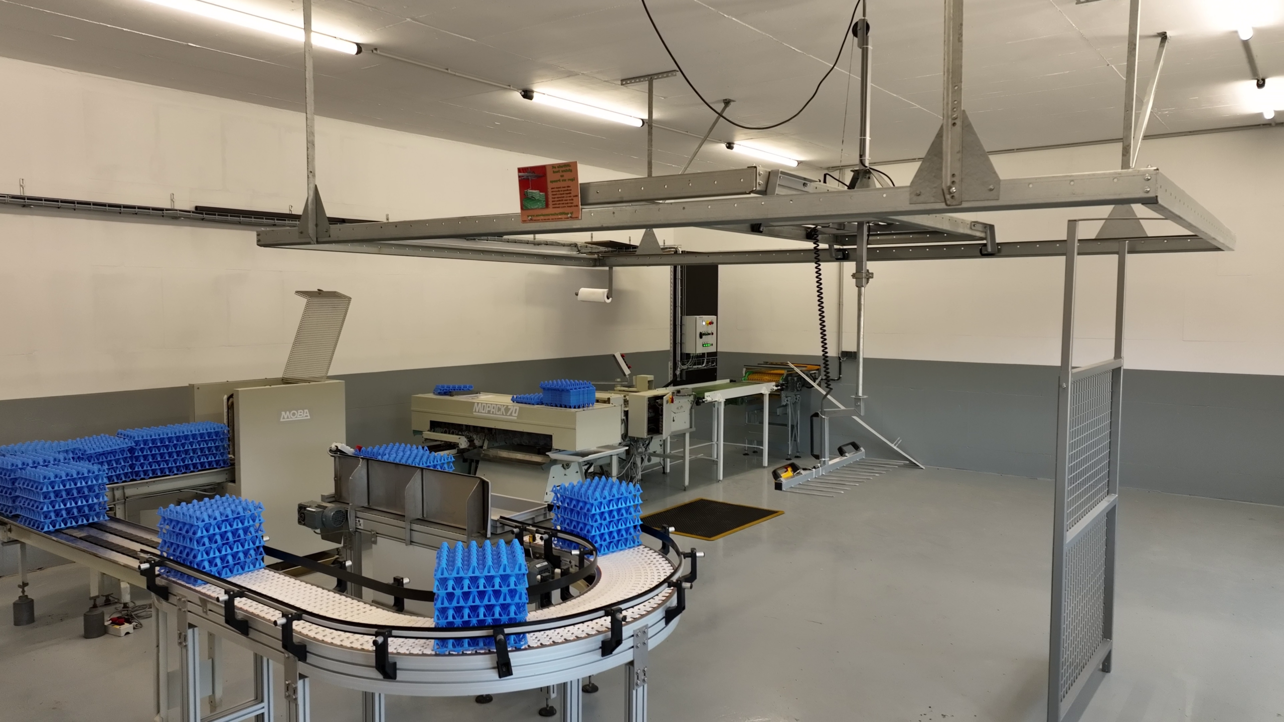 Im Legehennestall der Familie sorgt die Deckenabhängung für eine optimale Raumnutzung und verbesserte Luftzirkulation. Sie ermöglicht eine gleichmäßige Lichtverteilung der Amenta-Leuchten, was das Wohlbefinden der Hennen fördert.