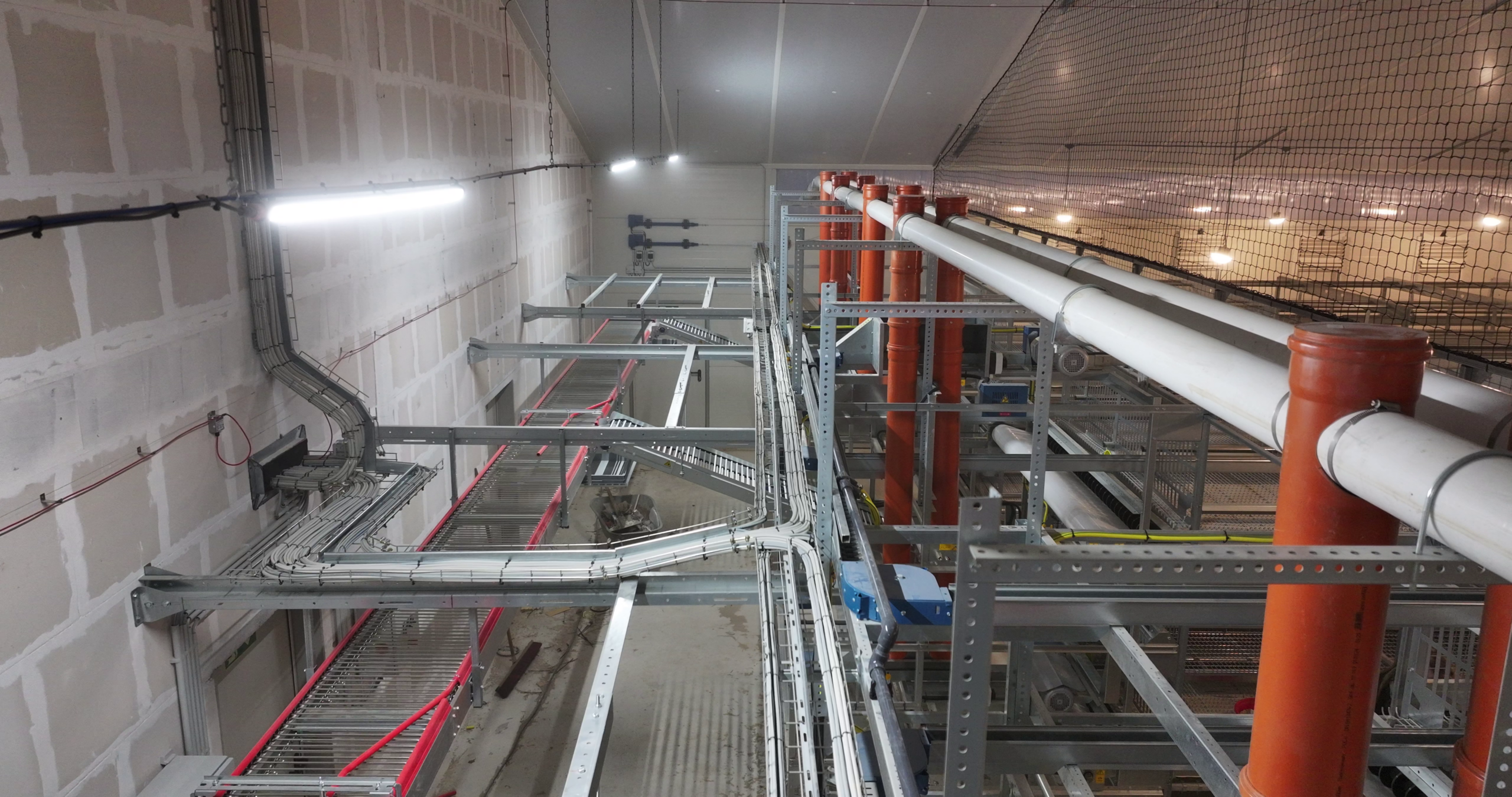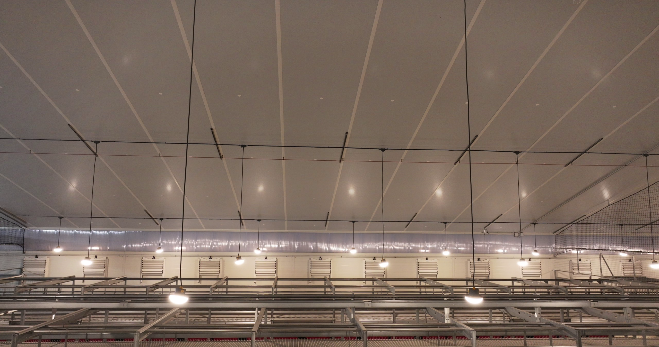 Im Legehennestall der Familie sorgt die Deckenabhängung für eine optimale Raumnutzung und verbesserte Luftzirkulation. Sie ermöglicht eine gleichmäßige Lichtverteilung der Amenta-Leuchten, was das Wohlbefinden der Hennen fördert.