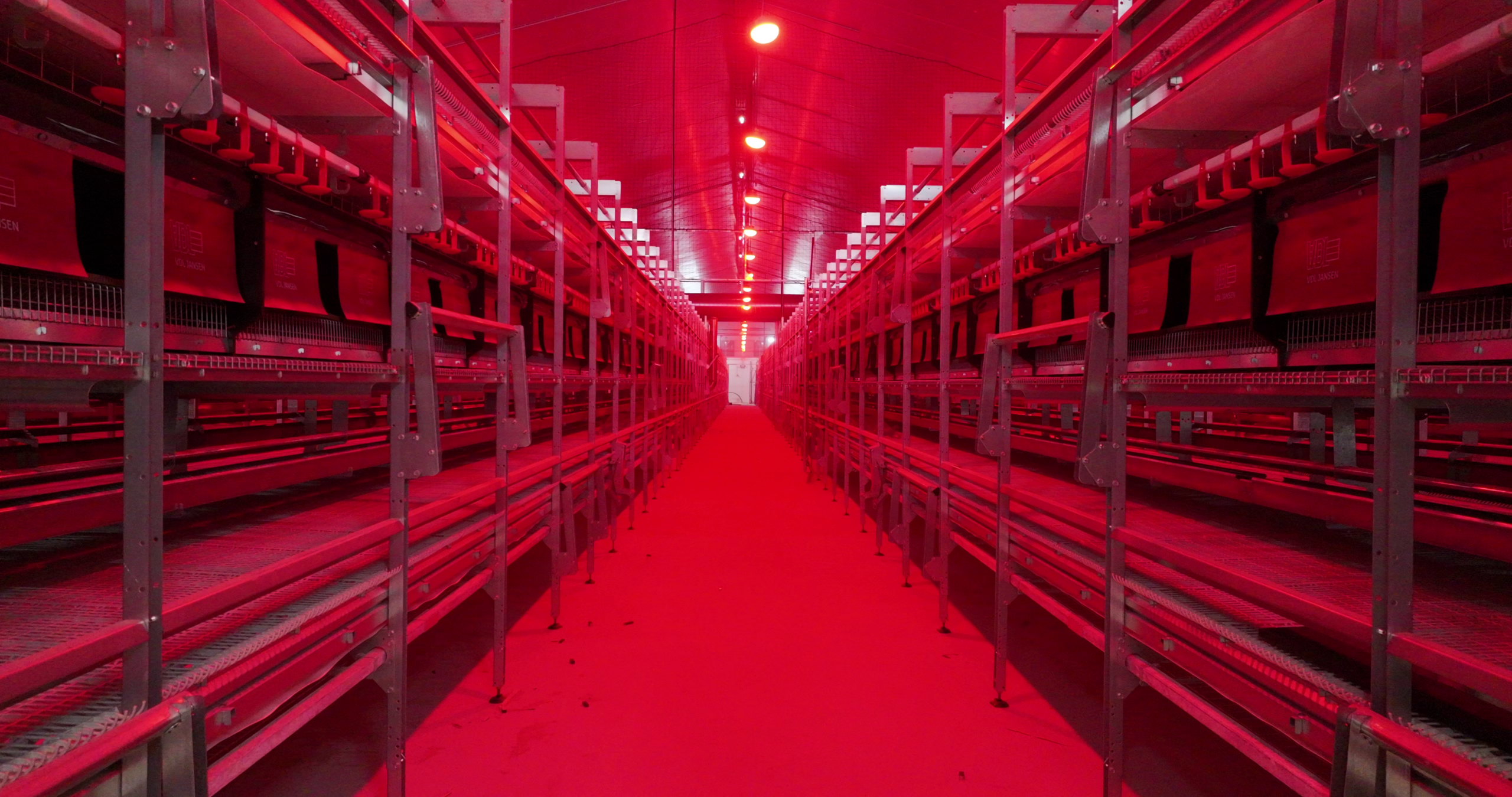 Das weiße Licht fördert die Aktivität und das Wohlbefinden der Hennen während des Tages, während das rote Licht in den Ruhephasen eine entspannende Atmosphäre schafft.